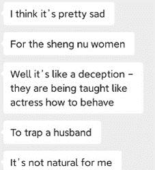 虽然她真的很努力,想要达到自己的目的,但别人不会理解的。所以如果真的有这种课,我建议告诉学员,不要把这种事告诉她们未来的丈夫,否则会引起信任危机。”