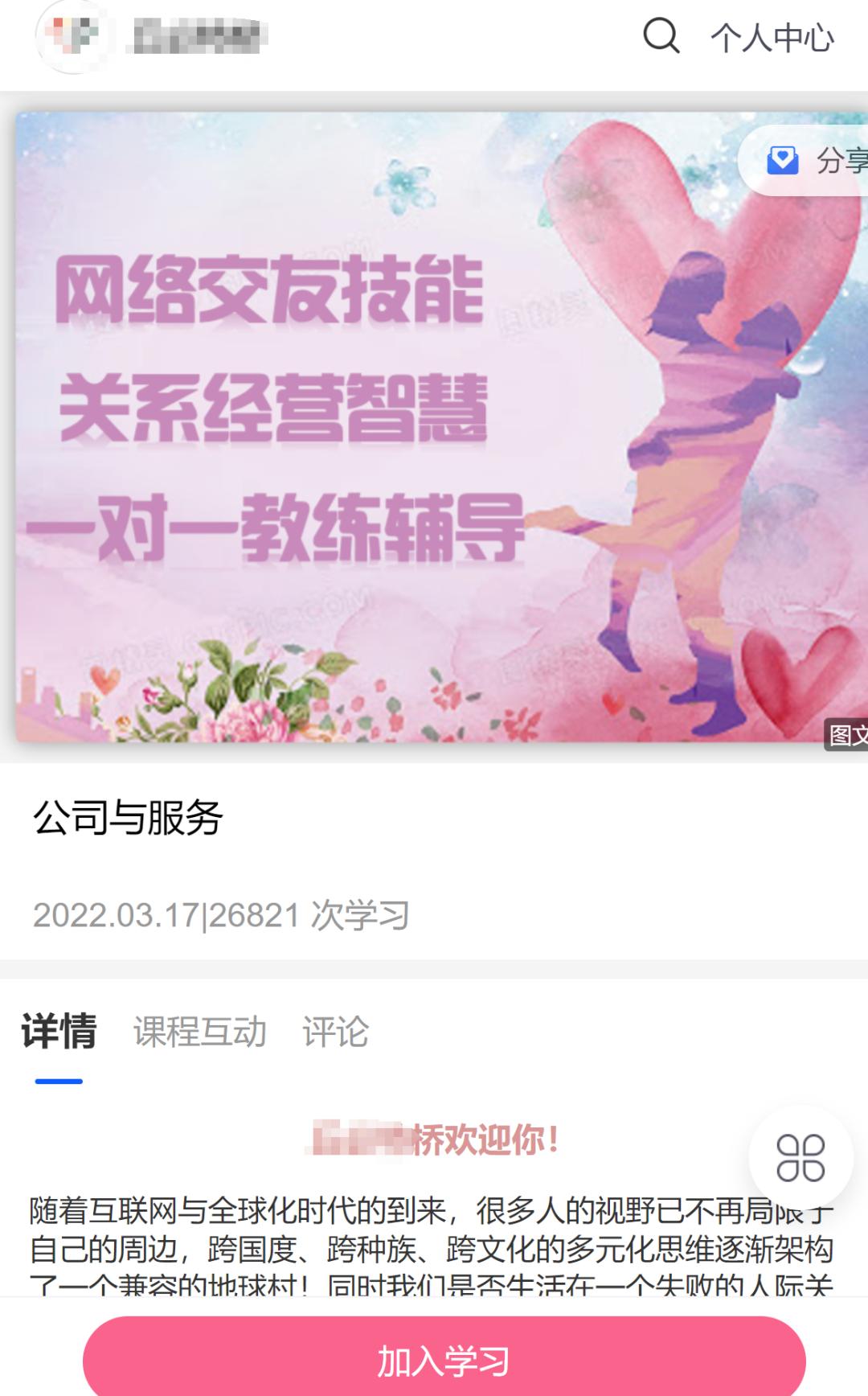 打开视频下方“女子学堂”的宣传链接,可以看到他们的业务范围写着:“网络交友训练服务、国际交友咨询服务、情感教练辅导服务”等内容。