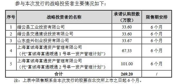 战略配售方面,缙云县工业投资有限公司、缙云县交通建设投资有限公司均拟认购33.6万股,山东益兴创业投资有限公司拟认购33.67万股,上海富诚海富通资产管理有限公司旗下的富诚海富通暖通1号单一资产管理计划、富诚海富通暖通2号单一资产管理计划分别拟认购67.33万股、101万股。