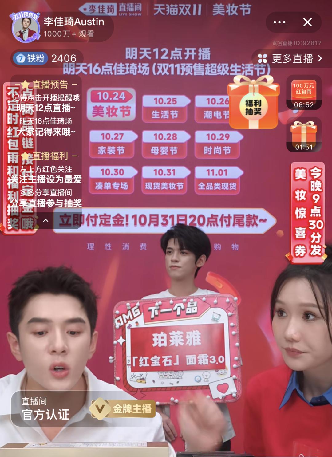 尽管受花西子事件影响,但10月24日晚8点,伴随着一声敲锣声,李佳琦直播间的双11预售开启。几乎同一时间,页面出现了卡顿,李佳琦用上扬的语调回复,“大家多刷新哦”。此时,直播间已经涌入了1000万+的观看。