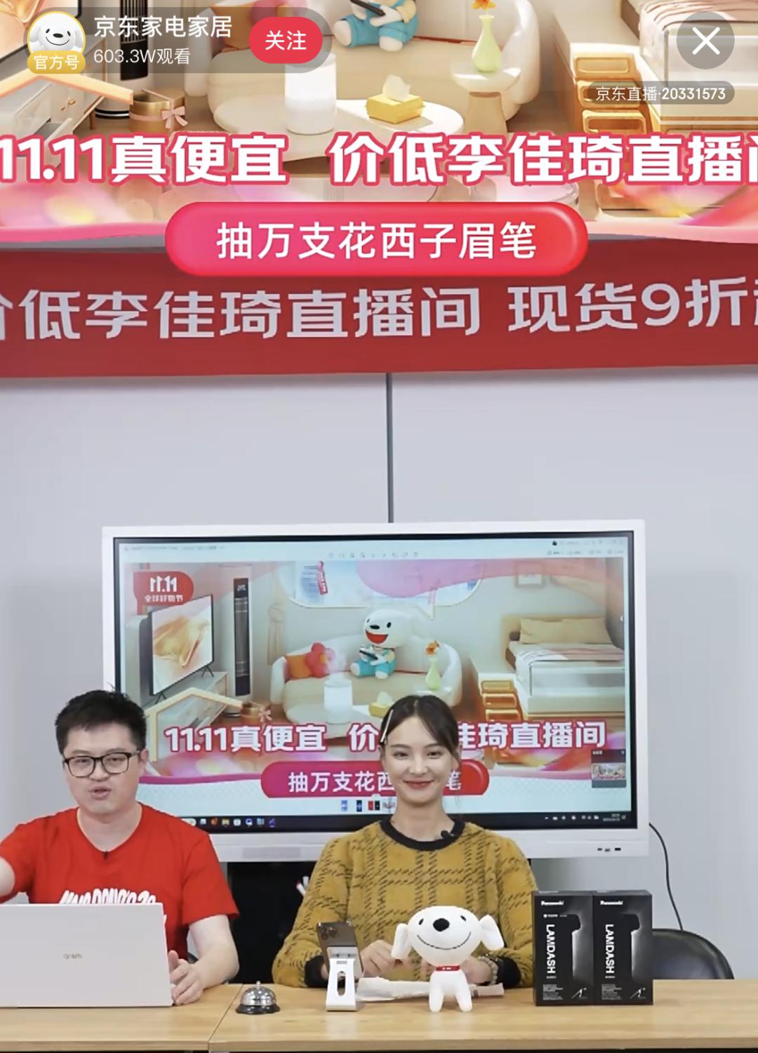 在“京东家电家居”直播间,记者观察到,“价低李佳琦直播间 现货9折起”“抽万支花西子眉笔”等字眼更是被直接写入直播间标题。