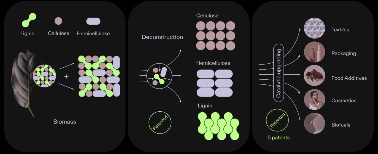 Bloom是第一家能够分离和选择性分解木质素的公司,其突破性技术可在分馏过程中仔细分离出生物质的不同成分,并基于各类成分生产不同产品。例如,用纤维素制造纺织品和包装,用半纤维素制造生物塑料,用木质素制造香料、化妆品和表面活性剂等,为生物质的全面利用及可持续碳经济铺平了道路。