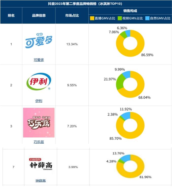 抖音2023年第二季度品牌畅销榜(冰淇淋TOP10)显示,可爱多市场占比为13.34%,伊利和巧乐兹分别占比9.55%、7.20%。钟薛高占比3.99%,仅为列第七。而在去年的6.18大促期间,钟薛高还曾是抖音冰淇淋品牌自播销售额第一、抖音电商排行榜冰淇淋行业爆款榜和推荐榜双榜单第一。