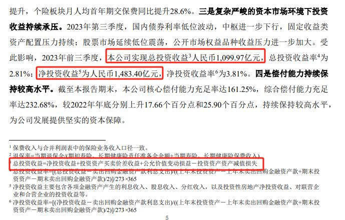 根据财报数据显示,前三季度,中国人寿实现总投资收益1099.97亿元,总投资收益率仅为2.81%。