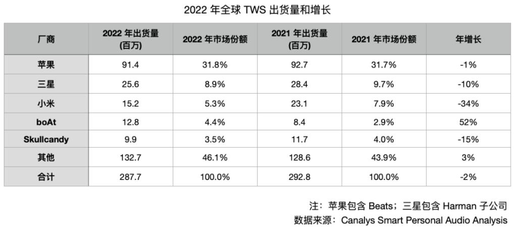 Canalys公布的数据显示,2022年全球TWS市场,苹果以9140万台的出货量和31.8%的市场份额稳居第一。当然,TWS行业已进入存量市场,整体出货量在逐渐下滑,苹果的TWS销量同比2021年也出现了1%的小幅下降。于苹果而言,当下最稳妥的选择,则是在AirPods产品线不大变的前提下,对各个型号进行升级更新,加入无损音频等具有突破性的功能。