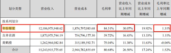 在2022年报中,年份原浆系列酒各项指标都“遥遥领先”,比如营收贡献上,121亿的营业收入占总营收167亿的70%以上,且营收增速30%,远高于古井贡酒系列酒和黄鹤楼。盈利能力上,84.51%的毛利率,同比增长了1.31%。