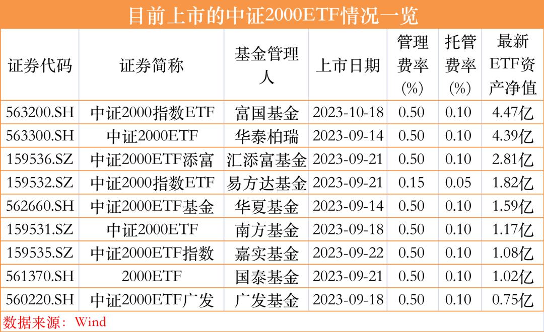 而在目前全市场9只中证2000ETF中,易方达是最先宣布降费的一方,目前易方达中证2000ETF的综合费率已经降至0.2%,其余8只中证2000ETF的综合费率为0.6%。“与中证1000ETF情况不同的是,目前首批中证2000ETF上市时间不长,规模差距并不大,规模最大的与规模最小的中证2000ETF之间差距不到4个亿,费率战或许能够再次扰动中证2000ETF的格局。”一位业内人士评价。