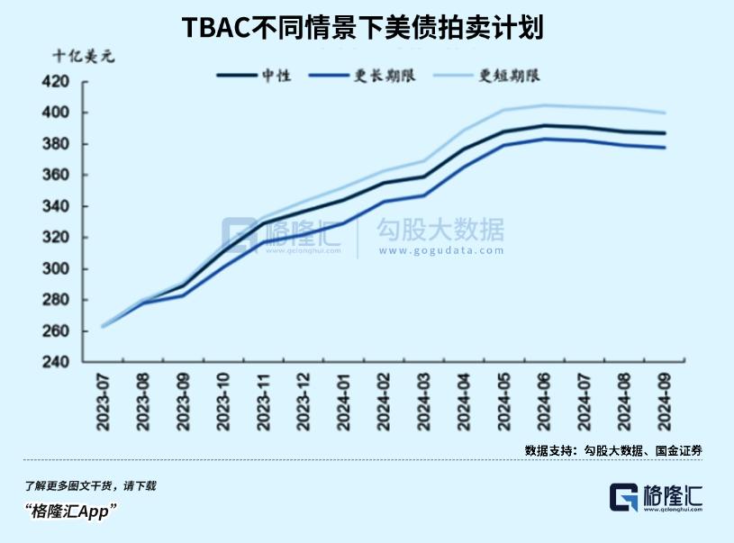 看今年四季度,美债发行量仍然会继续攀升。据国金援引TBAC在不同情景下的发债预测,请见下图: