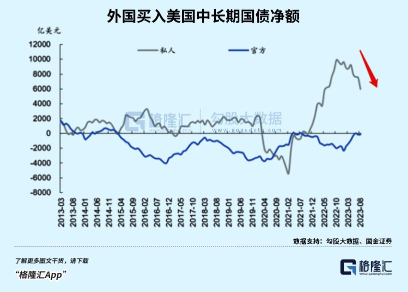 而美债需求,主要为外国官方机构以及私人机构(占比30%)、美联储(占比20%)以及美国国内家庭及非营利部门等。