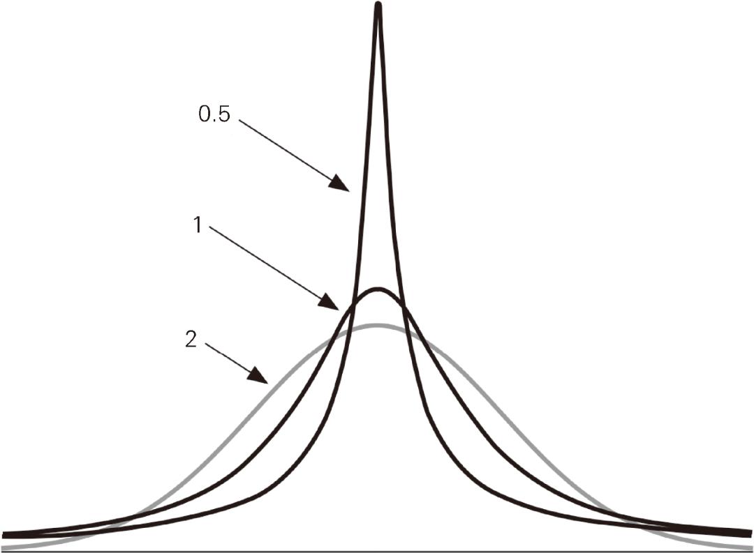 图 2 两种厚尾分布(黑色)和正态分布(灰色)的比较。这三种都是“稳定分布”,它们涉及一个参数,其值分别为 0.5、1 和 2