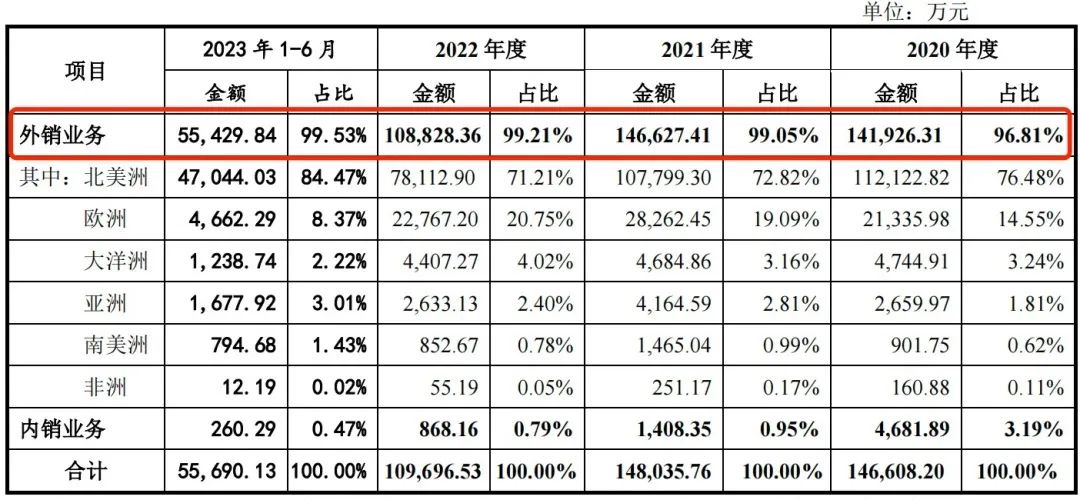 报告期内,公司的外销收入分别为14.19亿元、14.66亿元、10.88亿元和5.54亿元,占营业收入的比例分别为96.81%、99.05%、99.21%和99.53%。