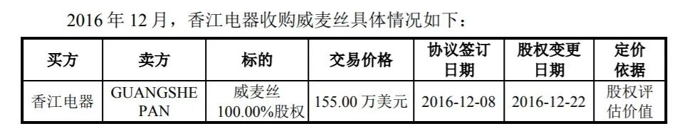 同时,潘允之子GUANGSHEPAN还将其持有的威麦丝100%股权以155万美元的价格转让给香江电器。