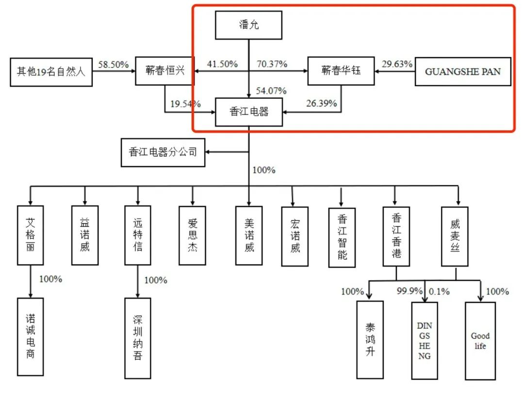 不过,在香江电器,潘允依然拥有绝对的话语权。截至招股书签署日,潘允直接和间接合计持有香江电器1.65亿股,占公司总股本的80.75%;潘允之子GUANGSHEPAN通过蕲春华钰间接持有公司1600万股,占公司总股本的7.82%;两人合计控制88.57%的股份,为实际控制人。
