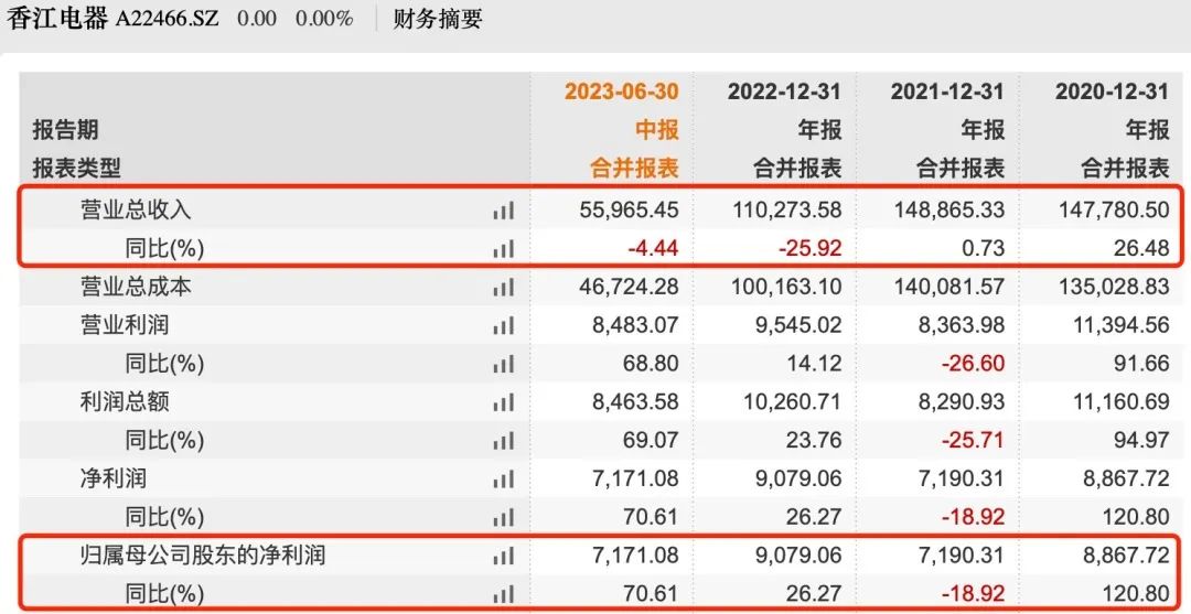2020年-2023年上半年(以下简称“报告期”),香江电器靠卖家居用品实现营业收入14.78亿元、14.89亿元、11.03亿元、5.60亿元;同期归母净利润分别为8867.72万元、7190.31万元、9079.06万元、7171.08万元。2022年和2023年上半年,公司营业收入持续下降,同比降幅分别为25.92%、4.44%。