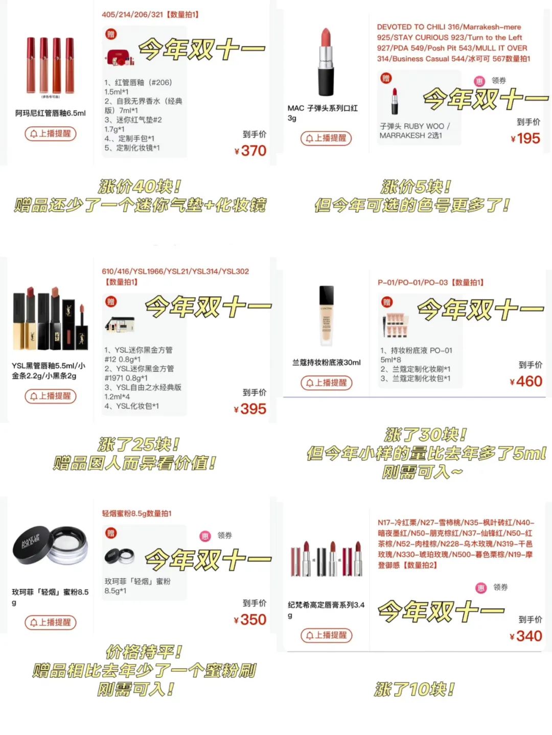 对比李佳琦双十一直播间一众国际彩妆大牌经典款今年与去年价格后可以发现,涨价已成为普遍现象。