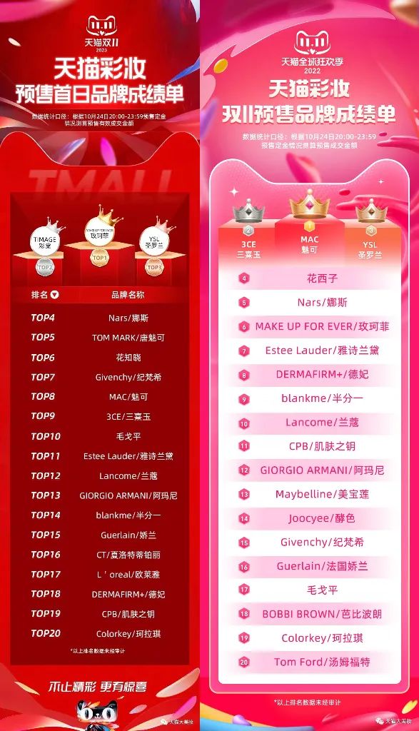 2023(左)与2022(右)双十一天猫彩妆预售榜单