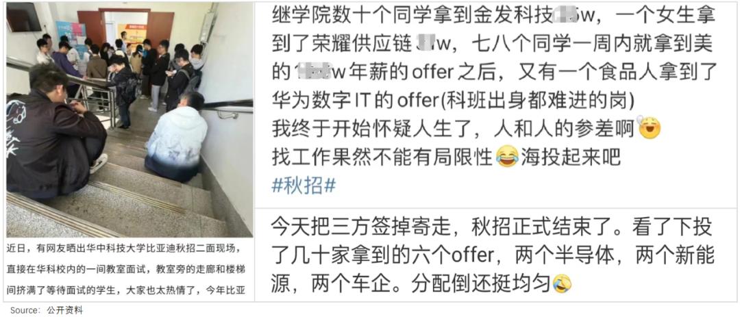 事实上,人气爆棚的不仅是比亚迪。社交平台“帮忙选offer”的帖子中,涌现了许多新能源、新能源汽车、半导体以及机器人高端装备制造等行业的新选项,进“工厂”的风潮正在席卷就业市场。