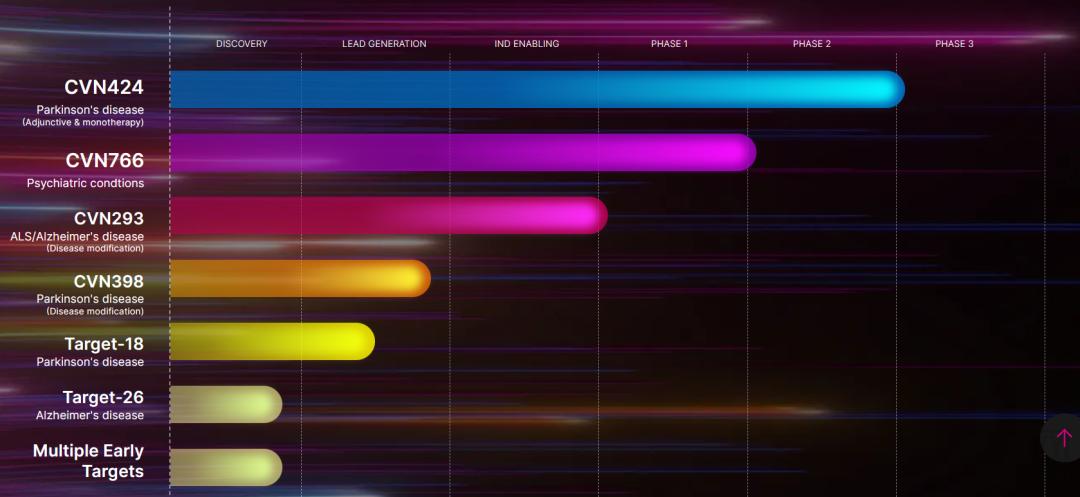 CVN424是具脑渗透性的非多巴胺能口服GPCR6反响激动剂,适应症为帕金森病。GPCR6作为G蛋白偶联受体家族的一员,仅在位于基底神经节回路的间接途径上的纹状体介质多刺神经元中高度选择性表达。与临床上常用于帕金森症的多巴胺替代疗法(L-DOPA)不同,CVN424选择性靶向与帕金森病相关的多巴胺D2受体依赖性间接信号通路,在产生和左旋多巴胺或脑深部刺激相同积极结果的同时,避免不良反应,帮助患者减少“OFF”期(指患者即使接受治疗后依然出现帕金森病症状的时间段)。
