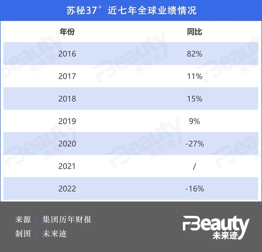 也许是受疫情影响,苏秘37°的销量出现进入中国市场以来的首次下滑,下滑幅度达27%。从这一年开始,苏秘37°的业绩销量似乎开始“一蹶不振”。继而2022年,LG生活健康也遭遇集团18年以来的首次下滑,其中美容部门下滑最严重,达27.7%。苏秘37°下滑16%。