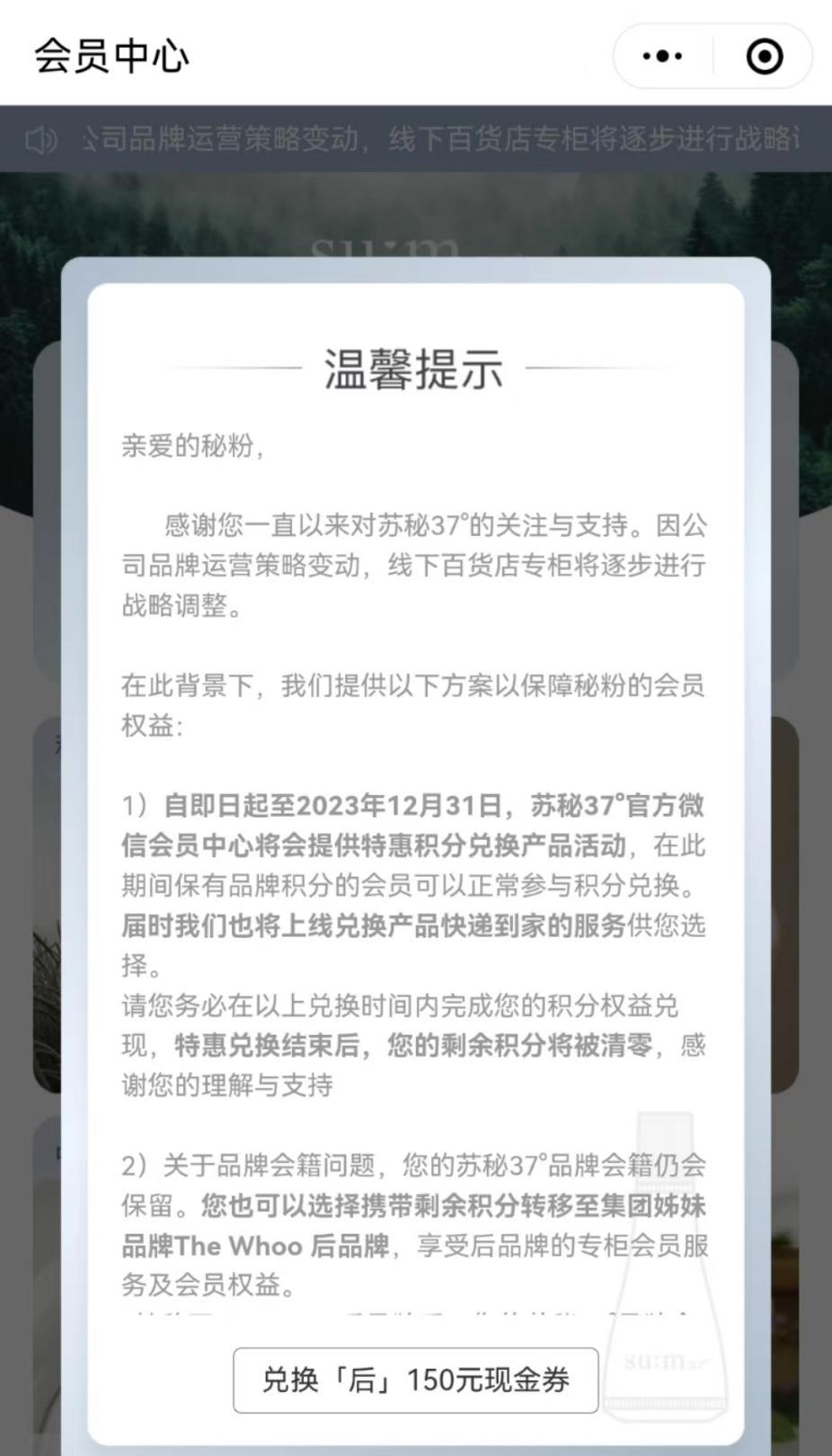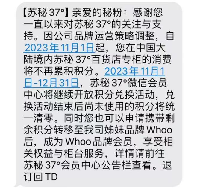 日前,不少苏秘37°的品牌会员表示陆续收到了短信通知,告知其进行积分兑换产品活动,并将剩余积分转移至集团姊妹品牌Whoo。