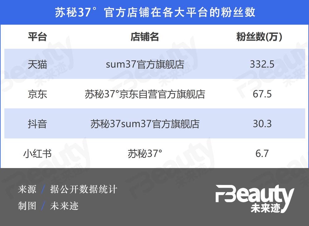 苏秘37°在线上天猫、京东、抖音以及小红书四大平台的粉丝数合计437万,其中天猫平台的粉丝数最多,达到332.5万,其次为京东,而在抖音平台粉丝数仅为30万。作为对比,其姊妹品牌Whoo后的抖音官方旗舰店粉丝数为107.3万。