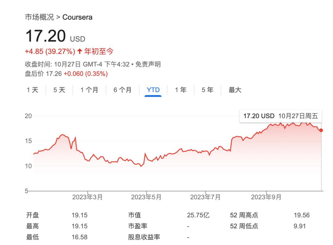 2023财年截至本季度的九个月,Coursera公司营收为4.7亿美元,同比上一财年同期的3.8亿美元,前三个季度营收增幅为22%。