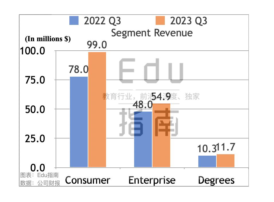 可以看到最新季度,Coursera公司三业务分部分别表现为同比增长,其中消费者业务营收同比增速较快。