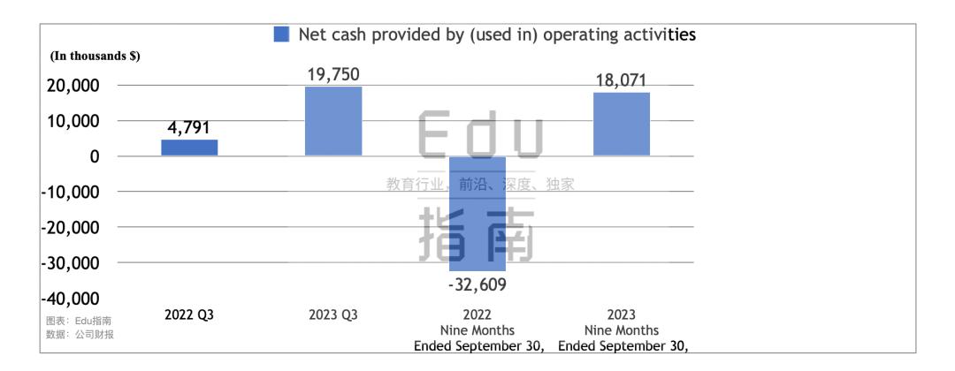 本季度Coursera公司经营现金流有所改善,其第三季度经营活动现金净流入额为1975万美元,上一财年同期为净流入额为479万美元。截至本季度的前三个季度,该公司经营活动现金净流入额为1807万美元,上一财年同期为净流出3261万美元,本期该项现金流由净流出转为流入。