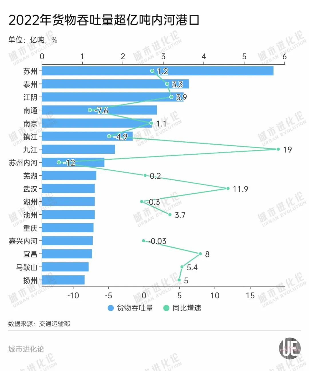 根据上海国际航运研究中心发布的《全球港口发展报告(2022)》报告,在前20大港口中,中国占16席,其中,苏州、泰州、江阴等长江内河港口,吞吐量排名位居全球第7、第15、第16位,超过安特卫普、南路易斯安那、洛杉矶等世界知名海港。