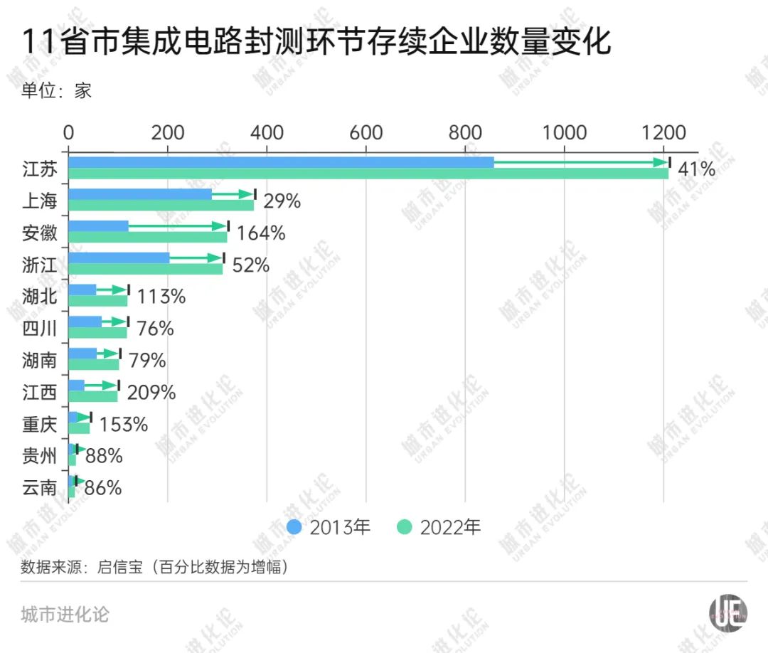 类似倾向,也开始在整个长江经济带产业分布中隐现。启信宝数据显示,2013-2022年十年间,沿江11省市在集成电路设计、制造、封测三大环节的存续企业数量均实现大幅增长,其中,江苏三大环节企业总数和增量均高居第一,明显领先其他省市。