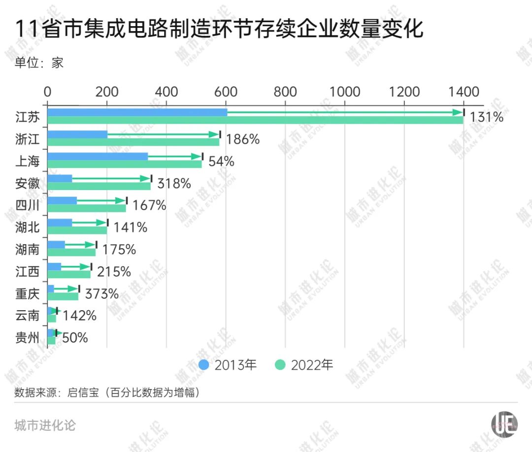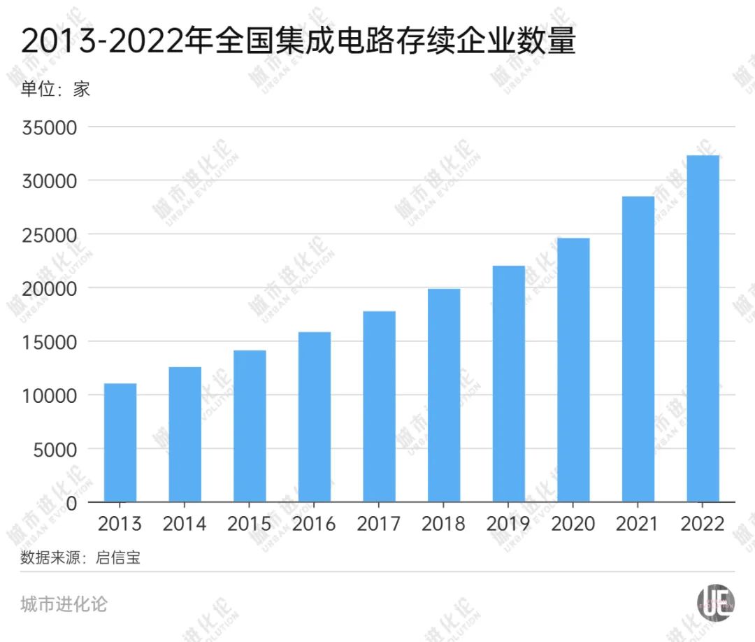 根据启信宝数据,2013-2022年,全国集成电路存续企业数从1.1万家增至3.2万家,十年增幅达190%。截至目前,全国集成电路存续企业共33629家。其中,长江经济带11省市16350家,占全国总数48.6%。