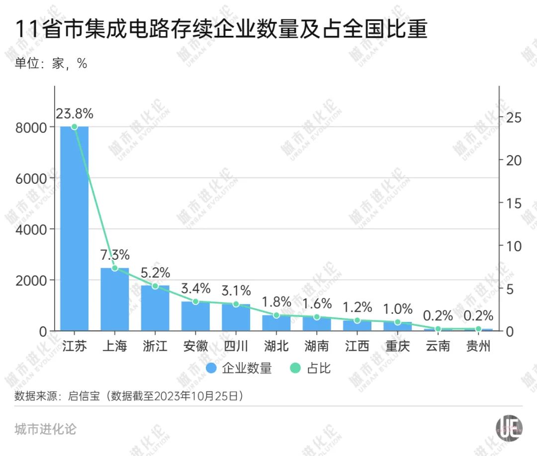 如今,上海已成为中国集成电路行业的“集大成者”。根据启信宝数据,截至目前,上海共有集成电路存续企业2448家,占全国7.3%。