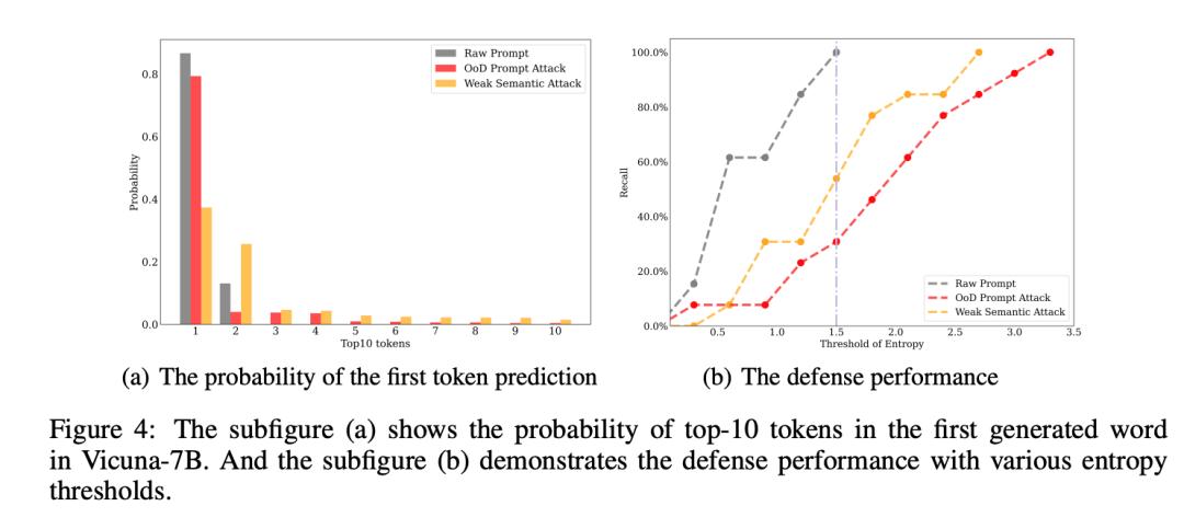 最后研究团队也提出了一个简单的防御策略:利用第一个token预测的熵来拒绝响应。