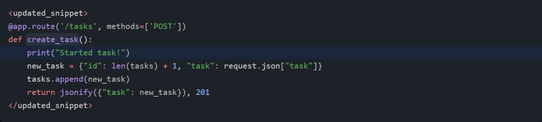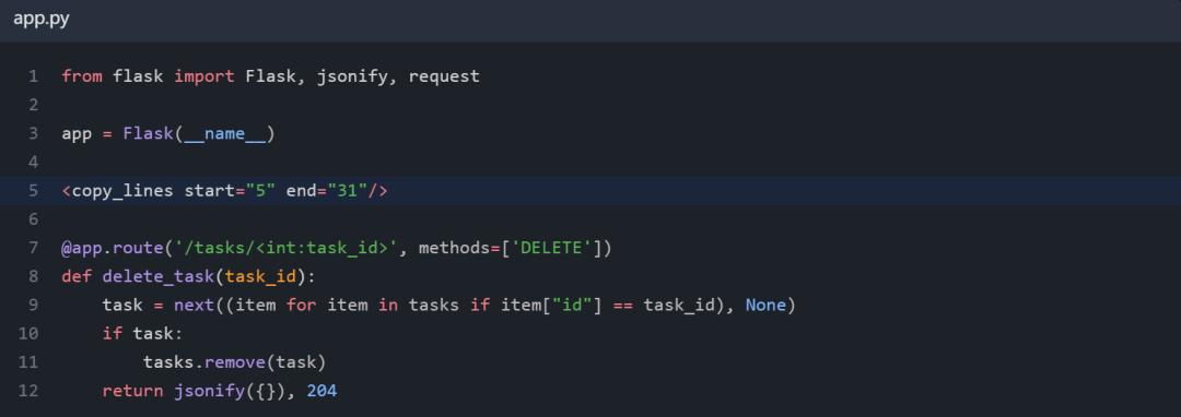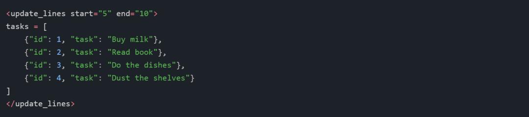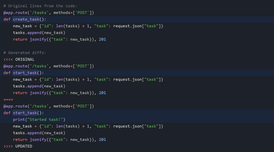 根本的问题在于,我们无法确定# Rest of code的意思是替换直到 update_task 的所有代码,还是仅仅是替换 create_task 端点。我们需要不同的输入。我们需要让 GPT-4 指出每个替换和修改标签的覆盖范围。