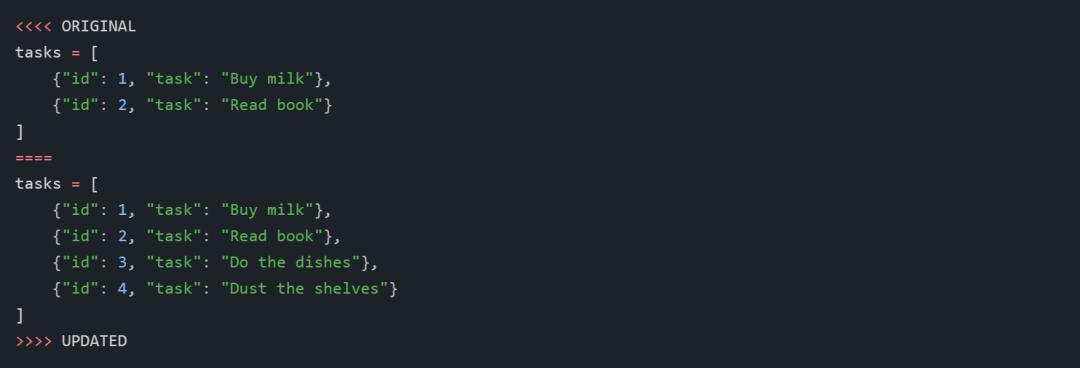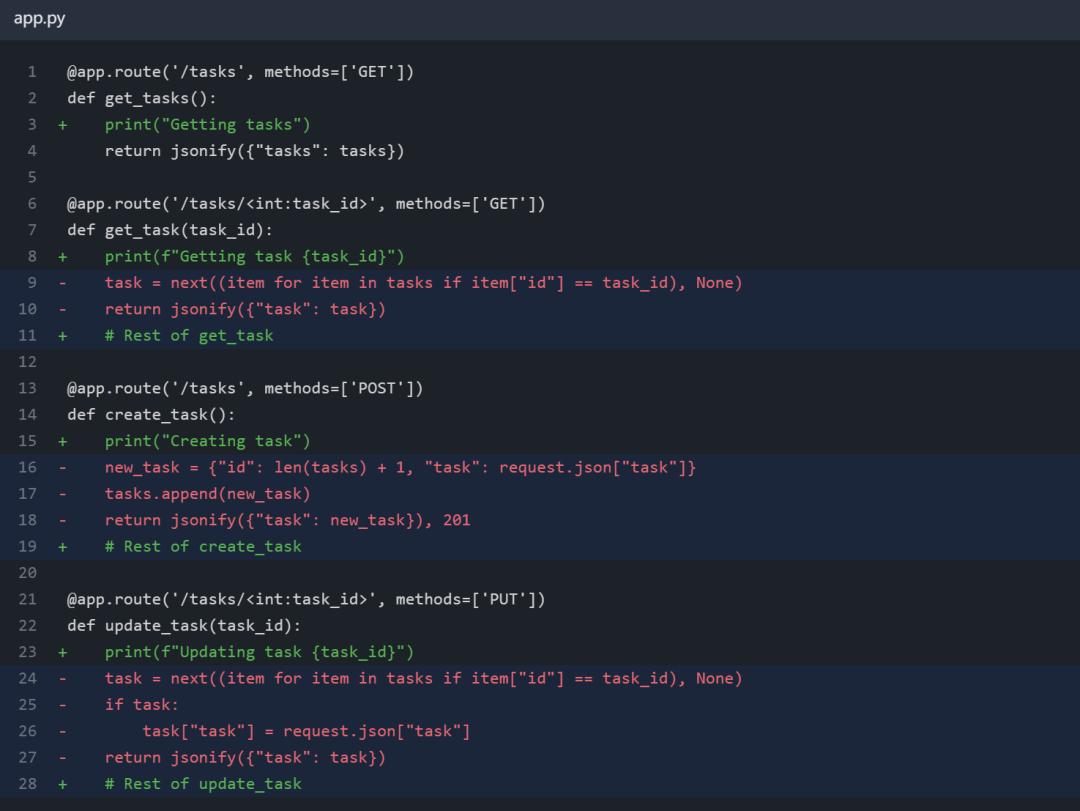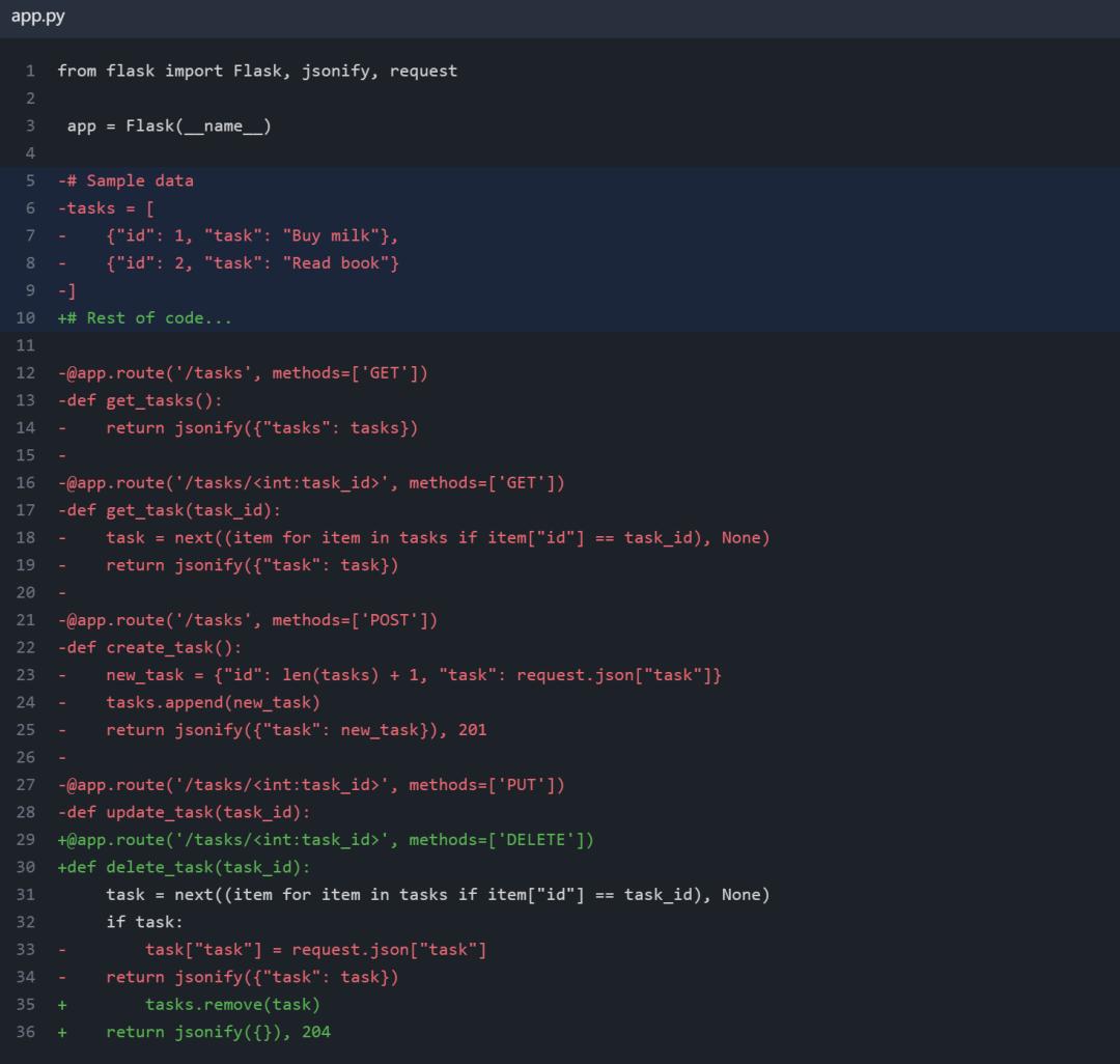 也许我们可以编写一个更智能的差异算法来捕捉这些讨厌的“Rest of code”注释。但即使如此,从算法角度来看,也不可能确定GPT-4的意图是要删除一切并添加新的 delete_task 端点,还是要将 update_task 端点替换为 delete_task 端点。