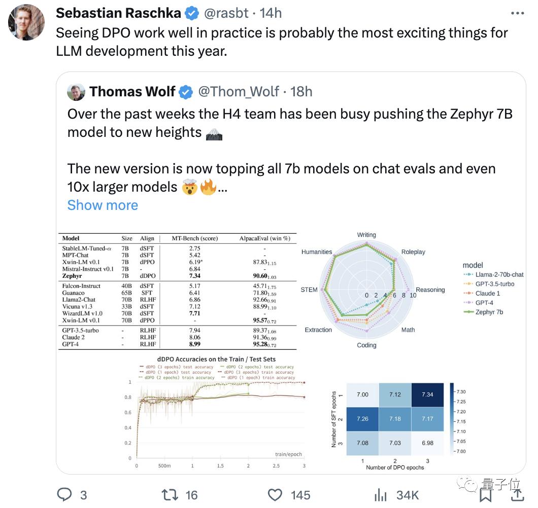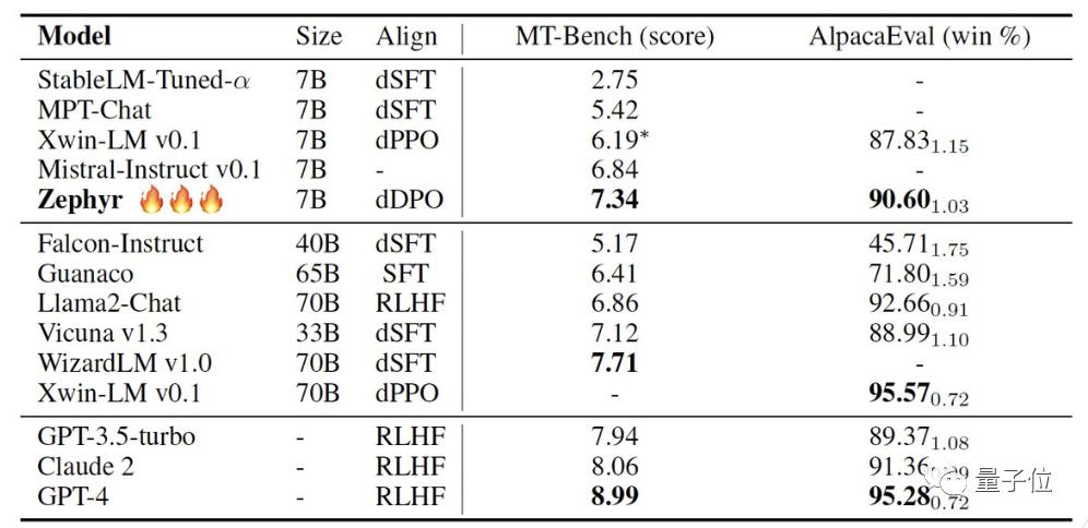 H4团队推出二代Zephyr-7B-beta。他们补充道,探索了从GPT-4、Claude 2中提取对齐性,然后将其注入小模型中的想法,开发出了将蒸馏直接偏好优化(dDPO)用于小模型的方法。