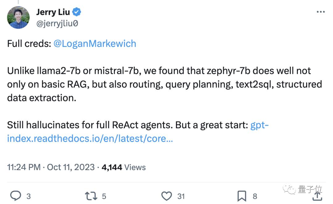 他们还继续补充道,Zephyr不仅在RAG上效果突出,而且在路由、查询规划、检索复杂SQL语句、结构化数据提取方面也表现良好。