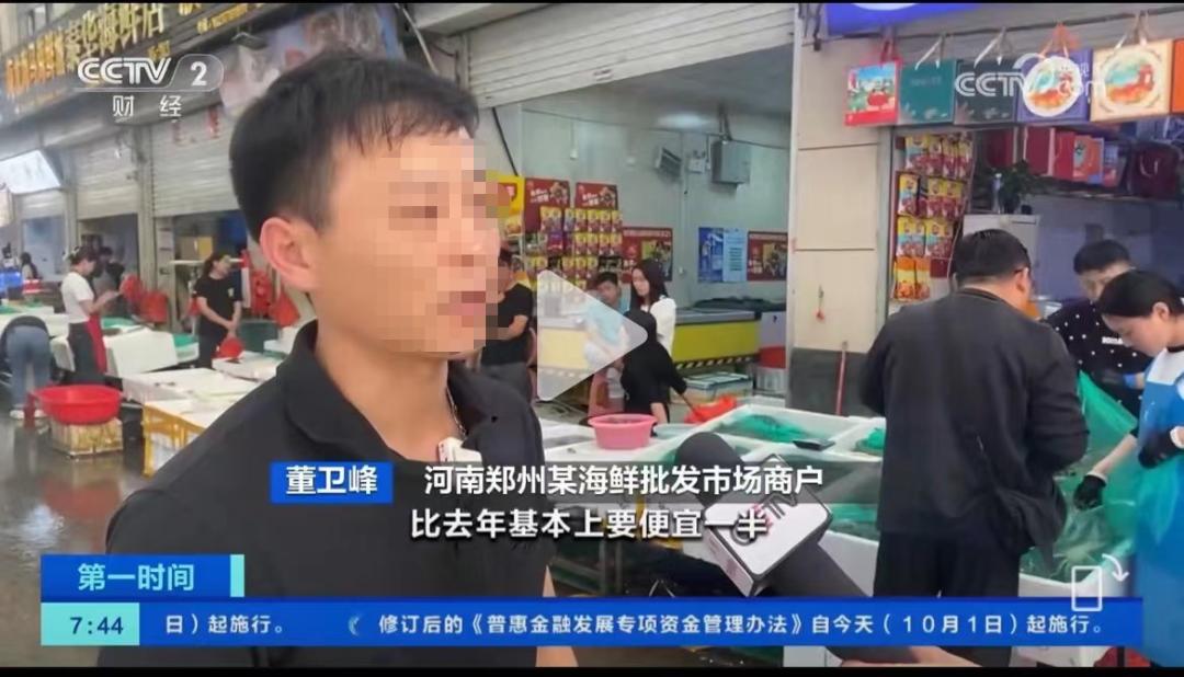 据央视财经消息,早在10月初,郑州某海鲜市场内就有商户称,由于今年产地养殖面积扩大,加之大丰收,大闸蟹价格较去年同期下降超40%。