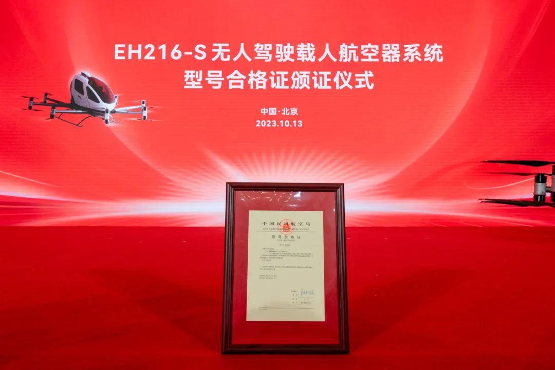 那一天是10月13日,亿航智能自主研发的EH216-S无人驾驶载人航空器系统获得中国民用航空局(以下简称“中国民航局”)颁发的型号合格证 (Type Certificate,以下简称“TC”) 。