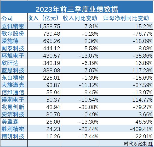 过去四年,与苹果公司合作愈加密切的立讯精密业绩增长是最明显的,2023年1月-9月收入、归母净利润分别为1559亿元、74亿元,是2019年同期的4.12倍和2.55倍。