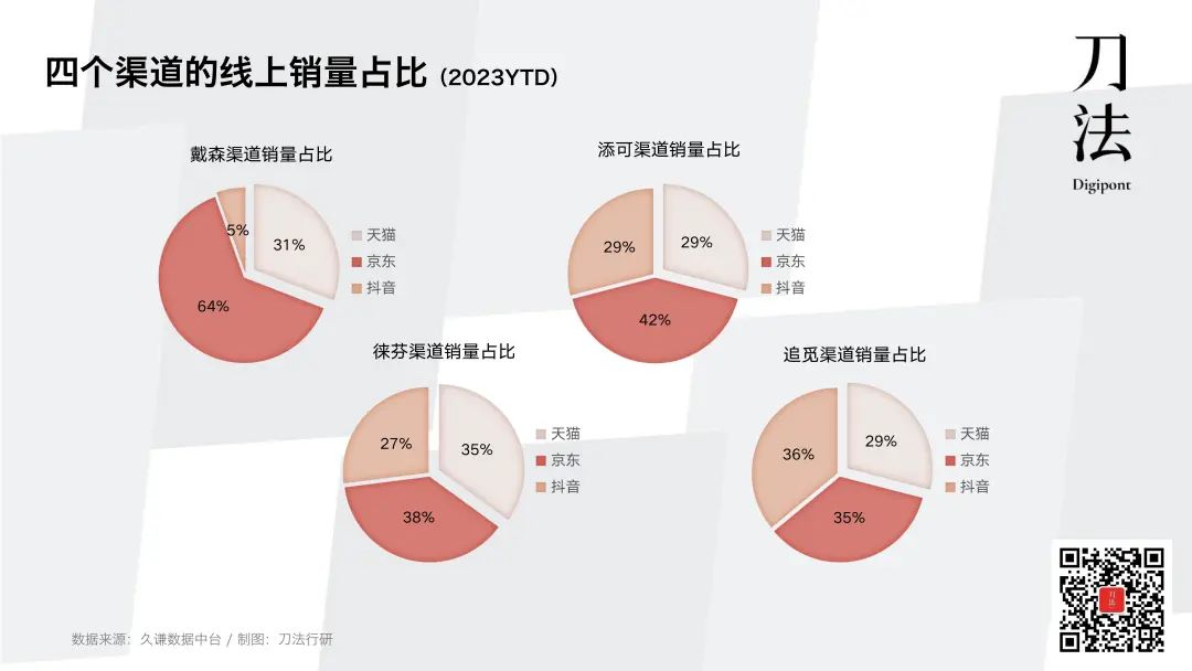 纵观戴森近几年在中国的增长,线上和线下各自对营收的贡献大约是四六开,分别来自于它的四大渠道事业部:线上、线下零售、礼品线及专业线。线下主要依靠门店和 KA 渠道,礼品渠道(如企业团购)和 B 端产品的销售也被计算进线下收入。线上则是天猫和京东各半,占据多数营收,抖音等新渠道收入有一些增长,但做的还比较浅。