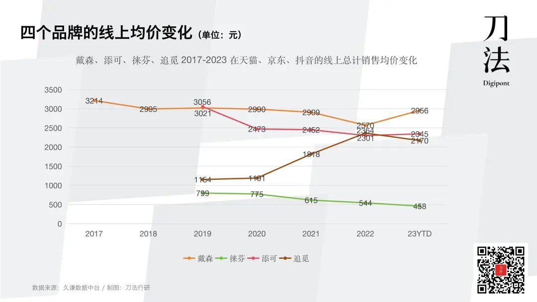 客单价也是一个值得注意的点。从 2017 到 2023 年,戴森的线上全平台均价一直维持在 3000 元左右,而添可从 3000+ 跌入 2000+,追觅从 1000+ 攀升至 2000+,而徕芬从 800 元左右进一步降低至 500 元以内。就市场大盘来看,洗地机和高速吹风机两个品类,正分别在向 2000 元和 500 元上下的市场主流价位靠拢。