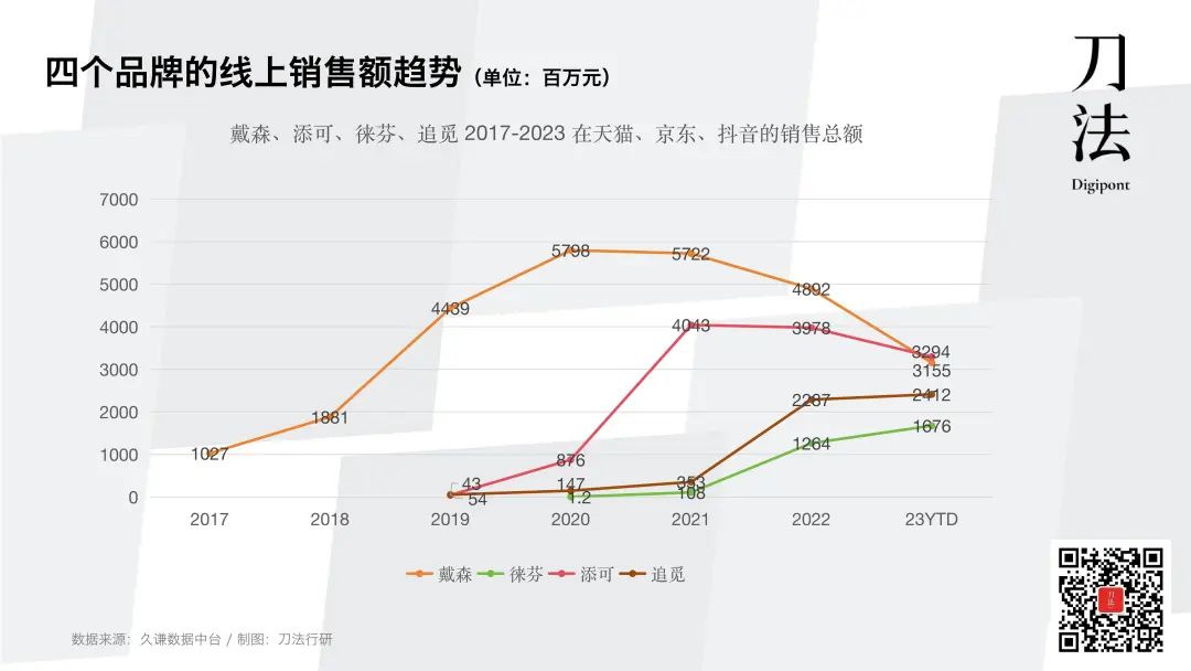 添可、追觅、徕芬等几个蚕食戴森市场的主要本土品牌,自 2019 年开始狂飙突进。2021 年,追觅的线上销售额仅 3.5 亿元,而徕芬刚破 1 亿。但到 2022 年,添可、追觅、徕芬在天猫、京东、抖音三个平台的 GMV 分别达到约 39.8 亿元、22.9 亿元 和 12.6 亿元。2023 年截止当前,添可的线上营收已略超戴森。