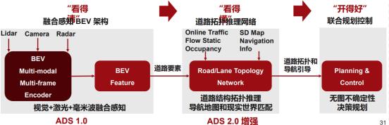 而在随后的升级中,华为ADS 2.0采用了与Tesla相似的神经网络架构,即通过BEV+Transformer对车道级拓扑进行推理,和通过GOD占用网络对不规则障碍物进行识别,从而实现不依赖高精地图的点到点导航辅助驾驶,并且传感器由标配3颗激光雷达减至1颗激光雷达,功能性不变的情况下,降低成本。