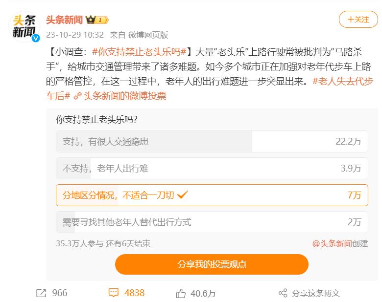 前段时间,北京被曝将禁止老头乐上路,一时间群情激奋,持各种观点的人在网上讨论不断。日前头条新闻发起了关于是否应当禁止老头乐上路的投票,目前已有35.3万人参与了投票,其中22.2万人赞成禁止老头乐上路,占比高达62.9%。