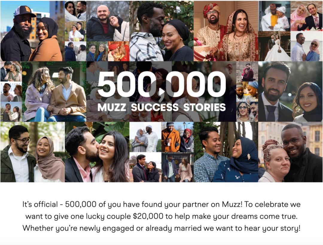 为获取更多用户,Muzz 还在 2023 年 6 月 29 日- 11 月 1 日期间发起了“幸运夫妇赢大奖活动”,如果夫妻双方是通过 Muzz 认识并选择进入婚姻殿堂,在投稿分享自己的恋爱故事后将有机会获得 2 万美元的婚恋基金,可用于蜜月、支付婚礼,或者买房买车。甚至用户也可以将自己知道的 Muzz 情侣故事分享到官方邮箱,一旦被采用成功也将获得 500 美元推荐费。