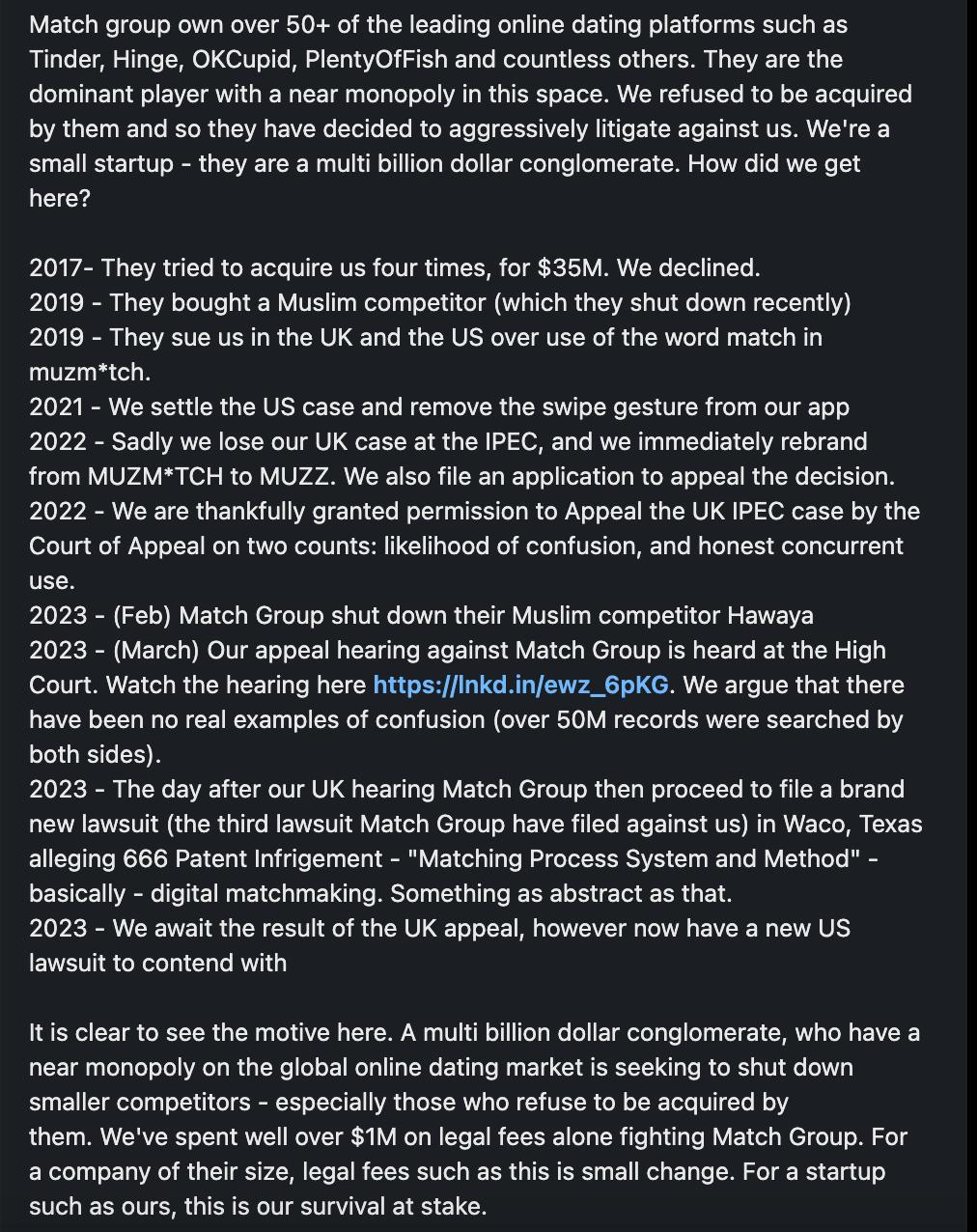 Shahzad 在 LinkedIn 上详细分享了“Match Group 状告 Muzz 的详细经过”,概括来看,基本可以理解为 Match Group 在收购失败后,先后三次将 Muzz 告上法庭,分别是以 Muzz 在产品中使用了滑动匹配功能以及 Muzmatch 中的 Match 涉嫌对“Match Group 旗下 Match.com”产品商标的侵权,并不当获利。
