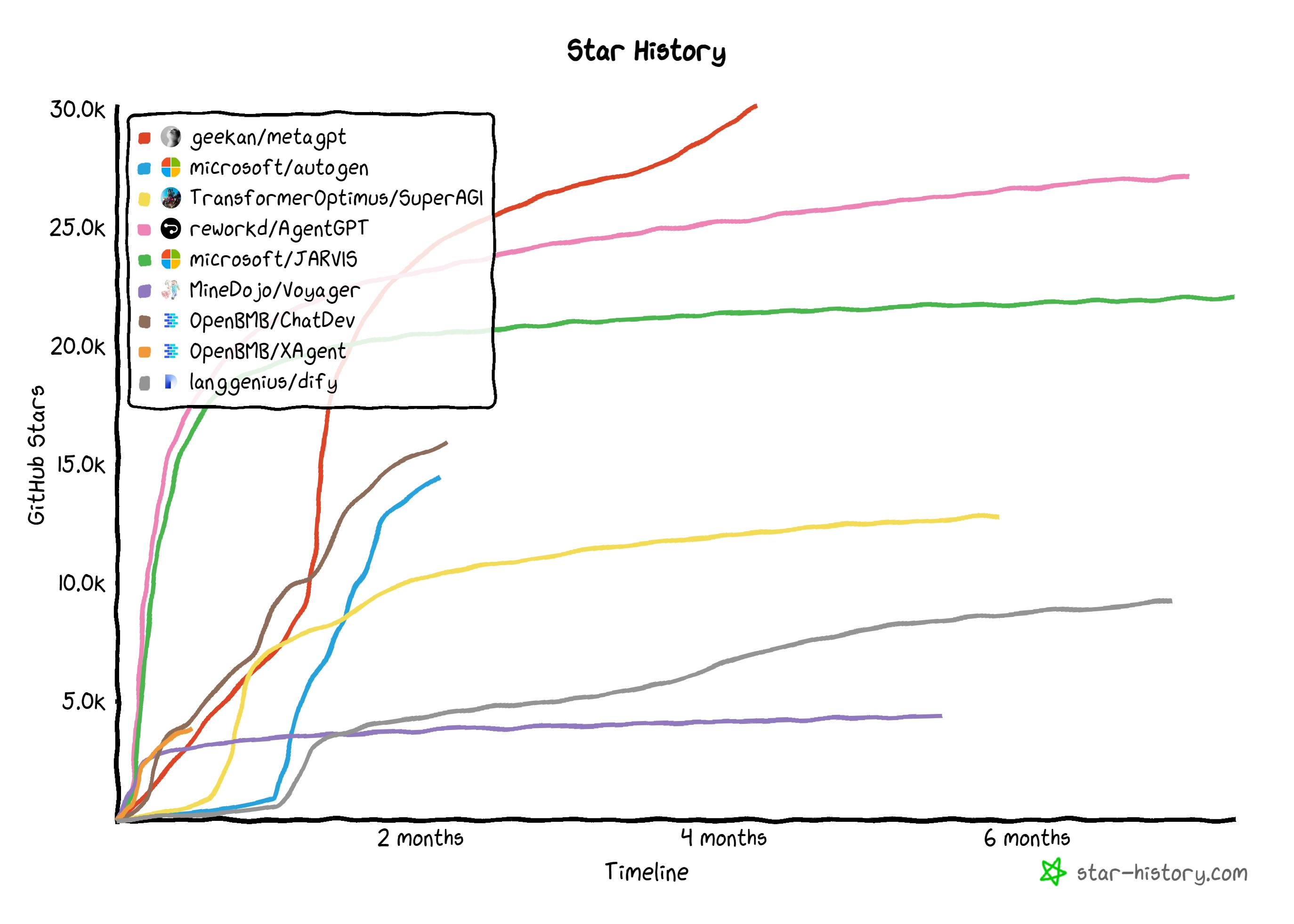 如就在10月,MetaGPT在GitHub上已经收获了3万颗星星,星星数是受关注度的指标。在开源项目star history的官网中可以看到,近期,MetaGPT的关注度呈陡然上升的情况,其关注度远高于同类的智能体框架。