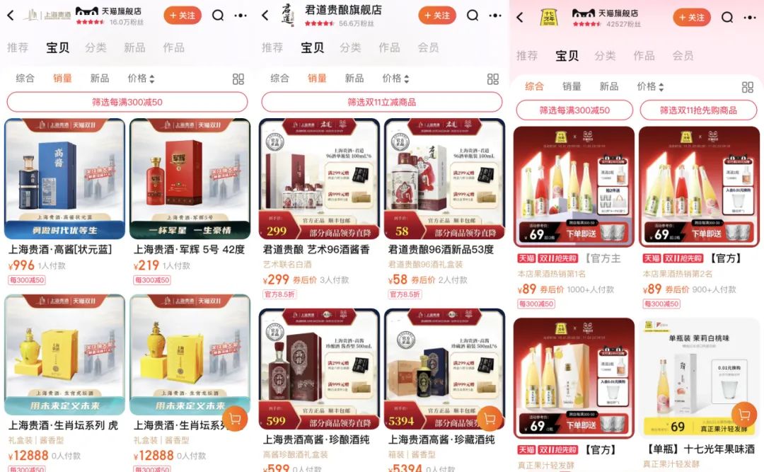 在核心酱酒类品牌天猫旗舰店中,产品月销多在个位数,甚至有些产品月销为0。销量较高的为果酒类品牌店,月销量最高的产品可达1000+。