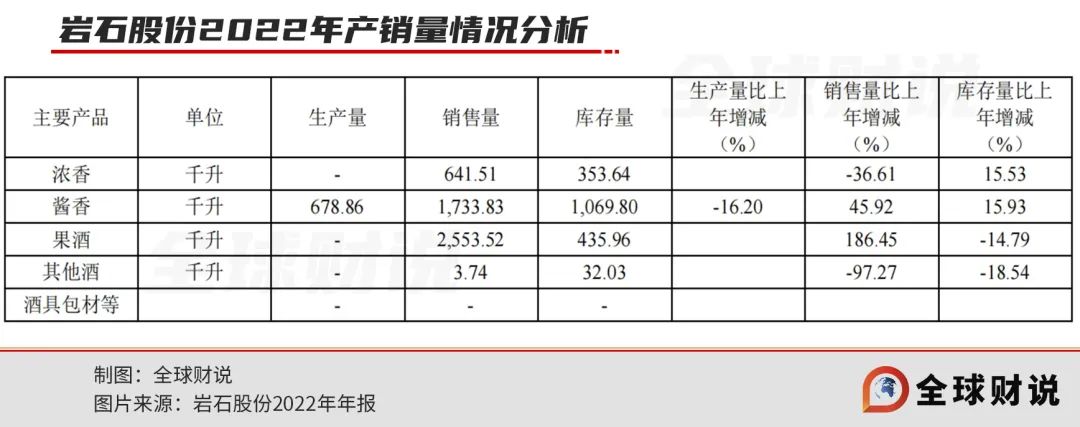 但实际上,如今的岩石股份仍在高度依赖外采。2022年,岩石股份销售1733.83千升的酱酒,但当期酱酒产量仅678.86千升。同时,浓香酒、果酒两大板块为100%依赖外采。